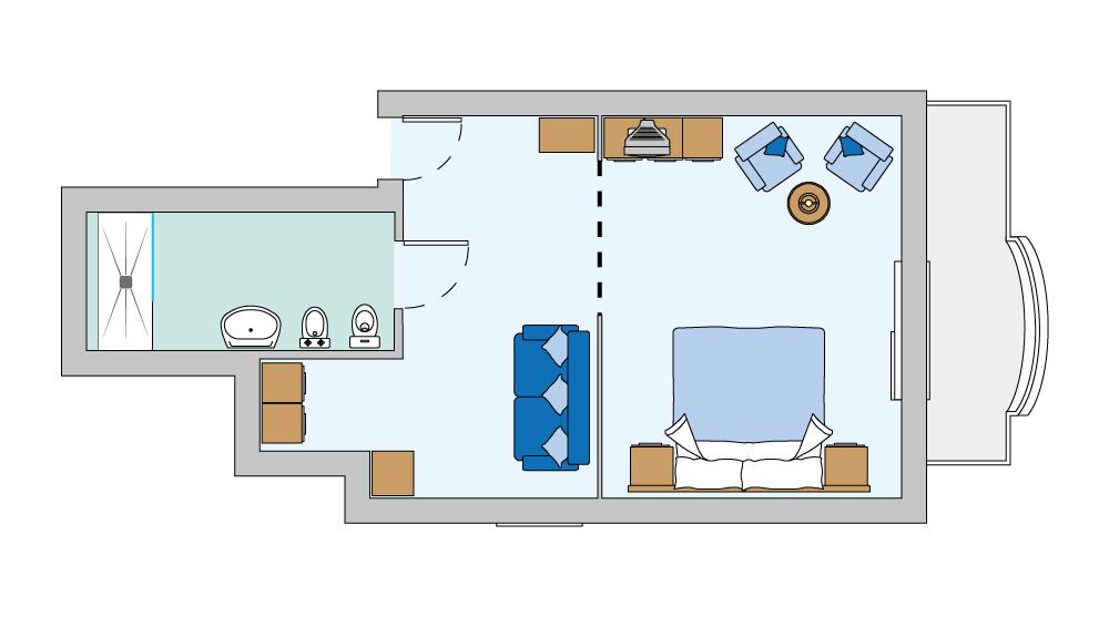 Ampia unità abitativa composta da camera da letto e soggiorno separati da una porta scorrevole; Elegantemente arredata nei toni del blu e del bianco; ampi letti king size e divano con due posti letto. Spazioso bagno con doccia.