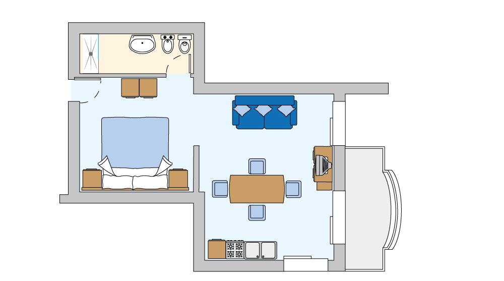 Ampia unità abitativa di circa 40 m2, composta da zona letto zona giorno con angolo cottura e frigo; letti king size e divano con due posti letto; c'è la possibilità di aggiungere una culla. Spazioso bagno con doccia.