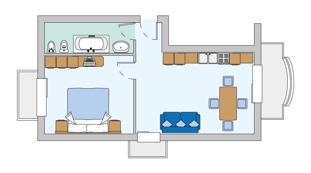 Ampia unità abitativa di circa 40 m2 con porta divisoria composta da camera da letto e soggiorno con angolo cottura e frigo; letti king size e divano con due posti letto; c'è la possibilità di aggiungere una culla. Spazioso bagno con doccia o vasca da bagno